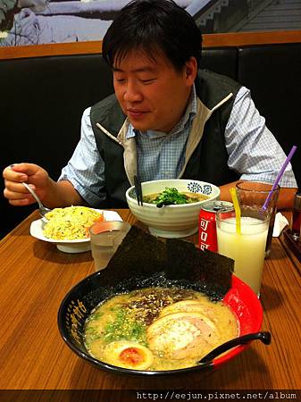 兩碗拉麵 + 一盤炒飯 + 小菜 + 飲料 + 偷笑的阿笨