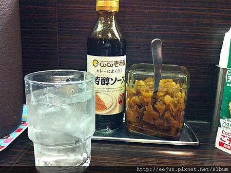 桌上有喝不完的冰水,與自行取用的醬菜。