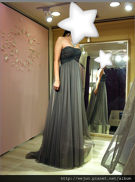 灰色平口禮服。cheri的禮服偏以aline or 魚尾較多。