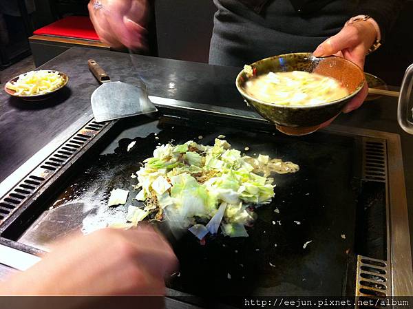 文字燒是要先將料放在鐵板上炒,炒到肉 or 海鮮快熟之後,把料圍成一個圈圈,再將麵糊淋到中間。