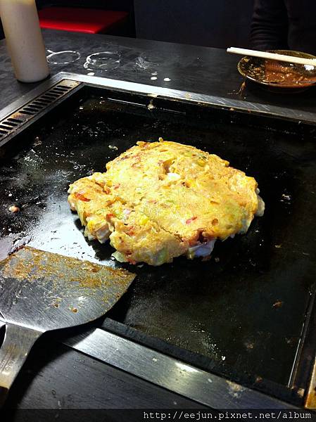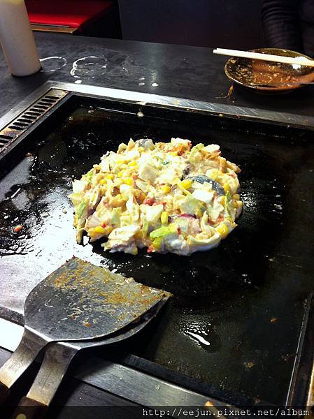 海鮮大阪燒。大阪燒的作法是在碗裡全部拌勻,之後一起倒入抹油的鐵板。
