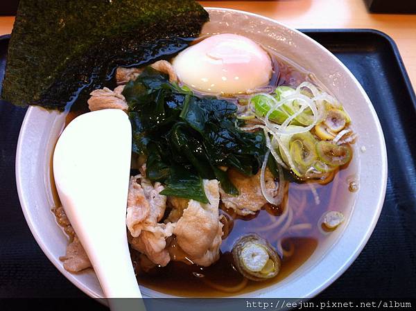 選用蕎麥麵,麵上鋪有豬肉片、蛋、海苔。一樣是清高湯。