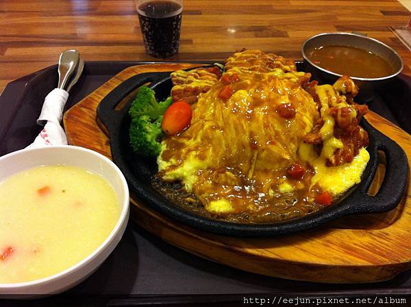 滑嫩的蛋皮,不似一般的雞肉咖哩蛋包飯,料裡雞肉為唐揚雞,在額外淋上芒果醬,真是絕配。