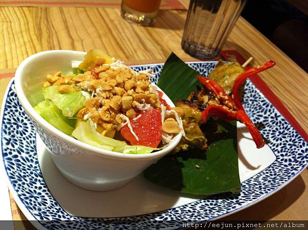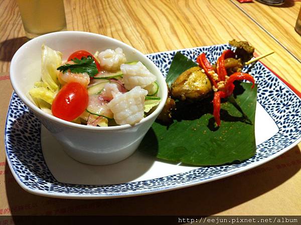 沙拉-涼拌海鮮+前菜-沙爹雞肉串
