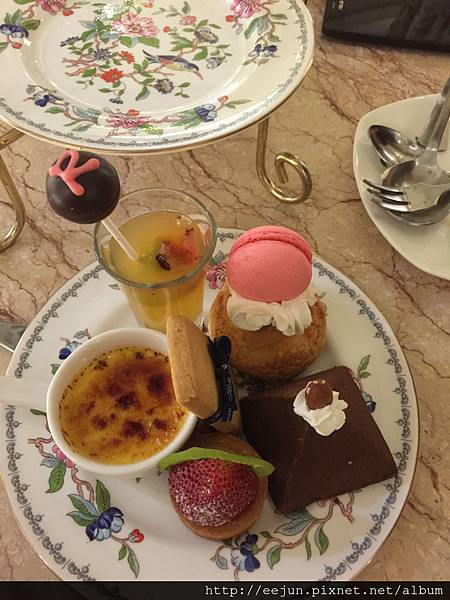 上層-烤布蕾 + 草莓塔 + 巧克力金字塔 + 草莓馬卡龍泡芙 + 百香果凍 + 緞帶奶油餅乾