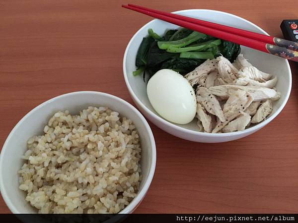 糙米飯 + 水煮蛋 + 水煮雞胸肉 + 燙青菜