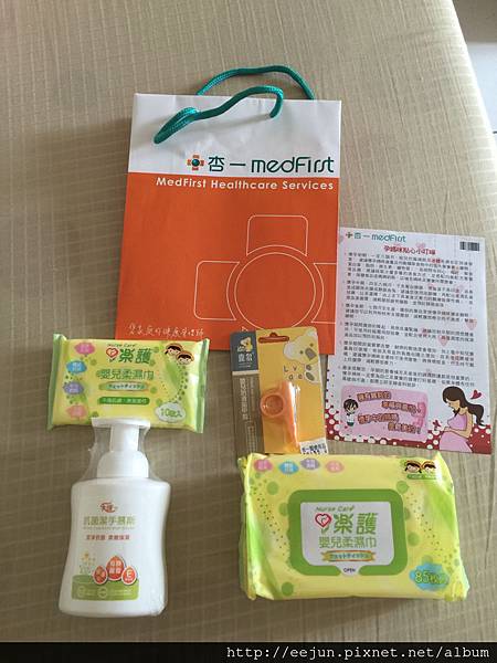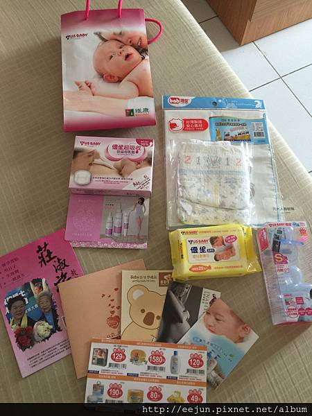 紗布浴巾、滿意寶寶尿布、優生濕紙巾隨身包、優生奶嘴&攜帶盒、優生溢乳墊、孕婦身體乳液、折價卷、月子餐DM、出生用品清單。