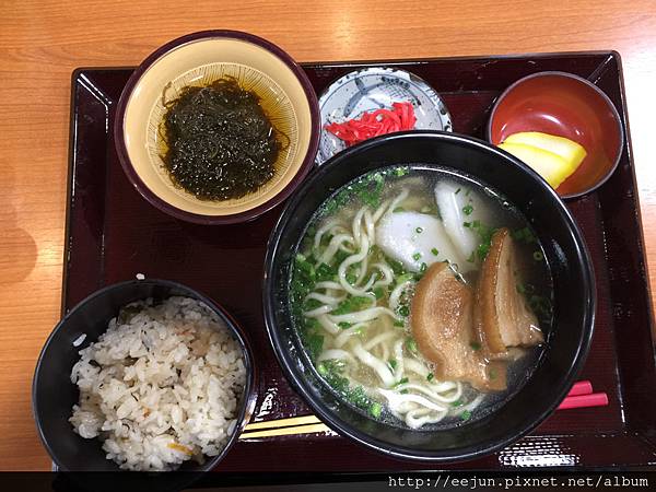 沖繩麵 + 炊飯 + 水雲 + 醃漬白蘿蔔、薑絲