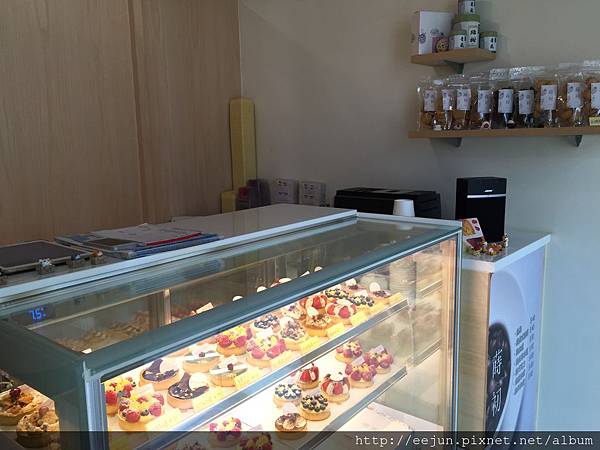 蛋糕櫃。裡面不大,但各個塔看起來都超好吃。
