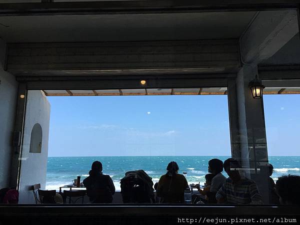面海的座位已經客滿,但還可以在室內眺望蔚藍大海。