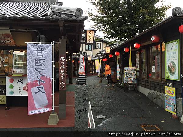 從溫泉旅館お宿 有楽 用過早餐後,出發到約五分鐘車程的湯の坪街道,
