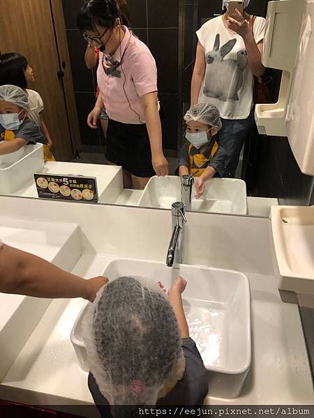 領隊帶著小朋友一起去洗手。