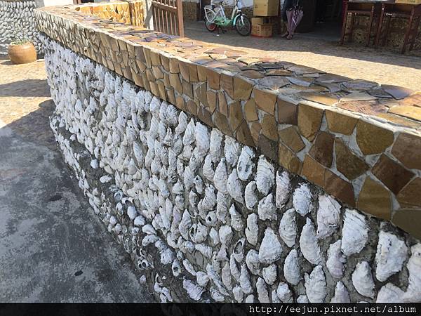 圍牆貼有蚵殼,象徵這裡的特產。